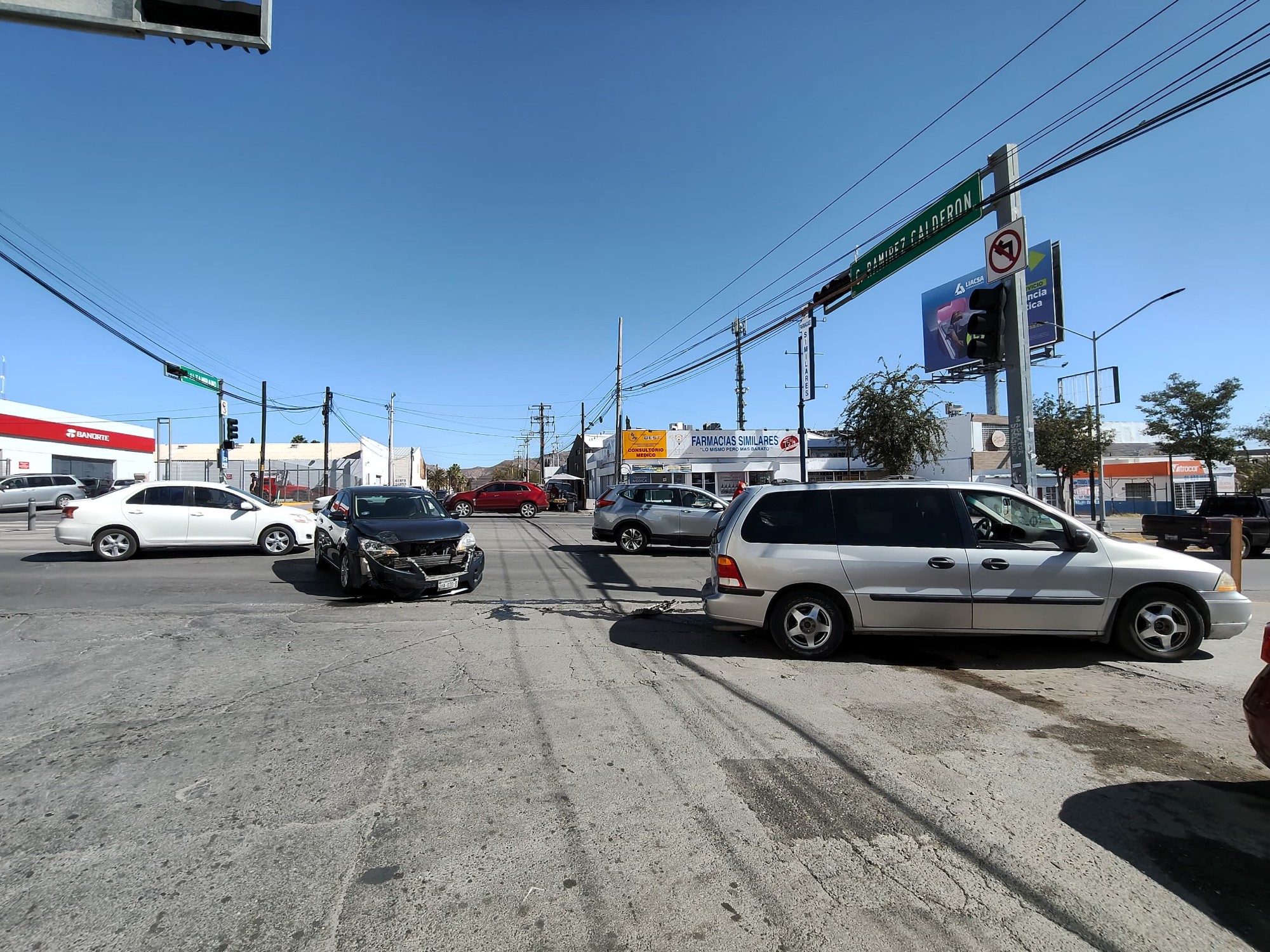 H. Cd. de Chihuahua.- Un aparatoso accidente se registró esta mañana en el cruce de la avenida Universidad y la calle Altamirano, donde dos vehículos protagonizaron un choque que dejó cuantiosos daños materiales.