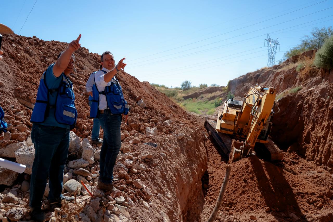 H. Ciudad de Chihuahua, Chih., a 29 de octubre de 2025.- El alcalde Marco Bonilla y el director de Obras Públicas, Carlos Rivas, realizaron un recorrido de supervisión en el arroyo de Sierra Azul, donde la maquinaria realiza excavaciones para levantar los soportes de concreto que sostendrán los muros laterales del puente.