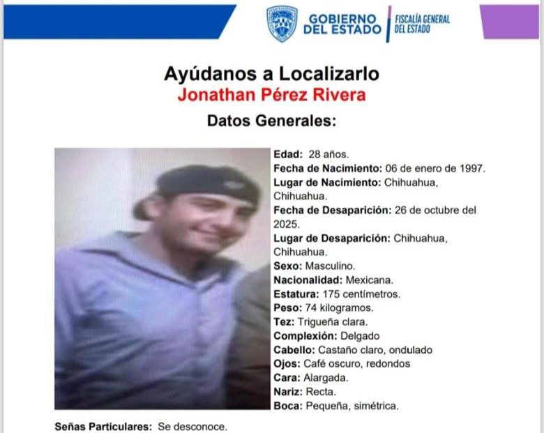 Chihuahua, Chih.- Familiares y autoridades se encuentran en la búsqueda de Jonathan Pérez Rivera, un joven de 28 años que fue reportado como desaparecido desde el pasado 26