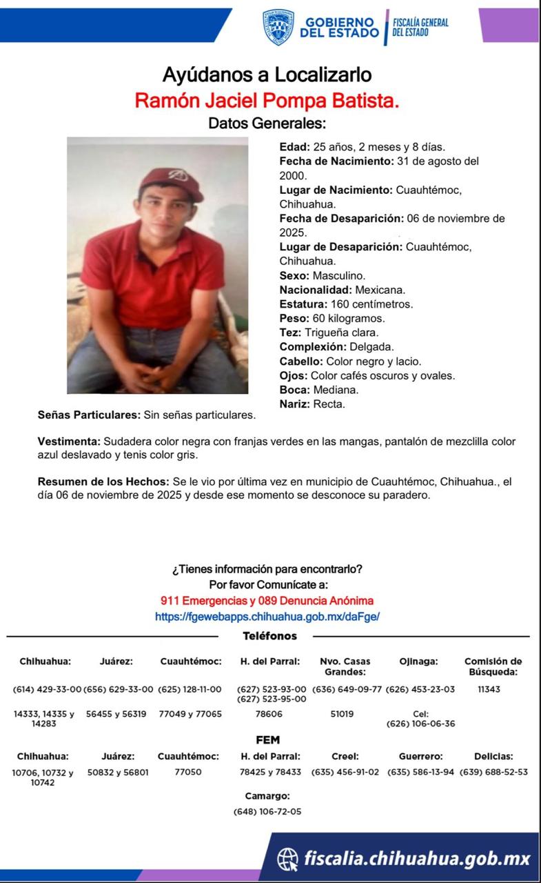 La Fiscalía General del Estado de Chihuahua emitió una ficha de búsqueda para localizar a Ramón Jaciel Pompa Batista, un joven de 25 años que fue visto por