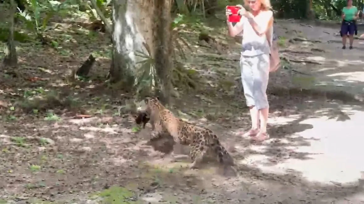 Un sorprendente momento se vivió este viernes en el Parque Nacional Tikal, departamento de Petén, cuando un jaguar apareció entre los árboles y cazó a un pizote frente