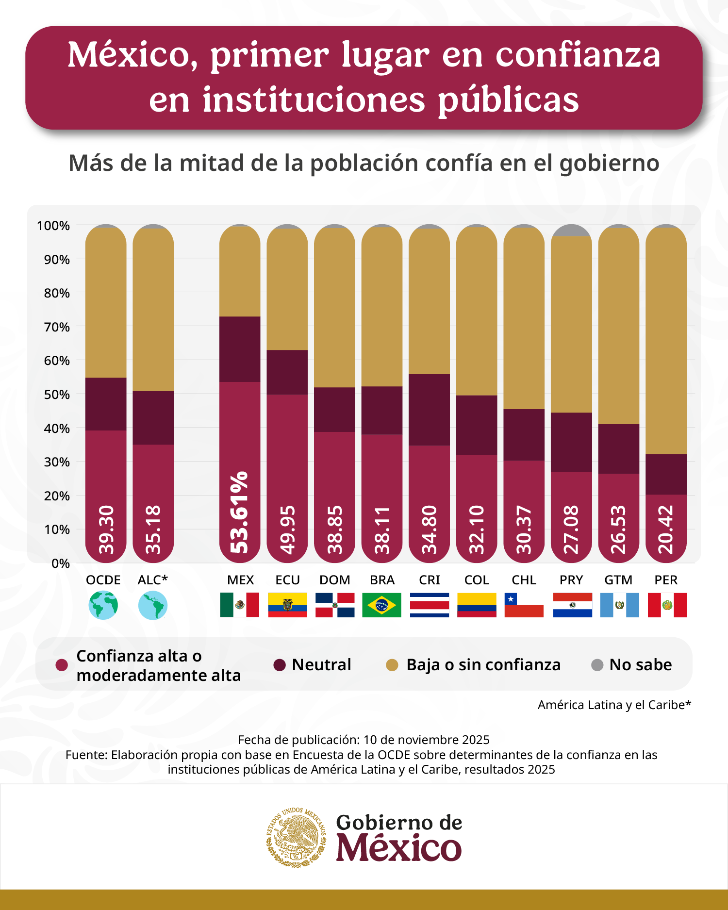 H. Cd de Chihuahua.- Según la imagen compartida por la presidenta de México a través de sus redes sociales, el 53.61 % de los mexicanos manifestó tener confianza en su gobierno e instituciones públicas, de acuerdo con la Encuesta de la OCDE sobre los determinantes de la confianza en las instituciones públicas de América Latina y el Caribe 2025.