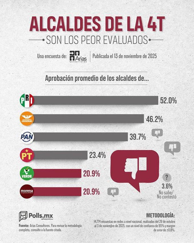 Una encuesta de Arias Consultores, publicada el 13 de noviembre de 2025, posicionó a los alcaldes de los partidos de la 4T (Morena, PT y Verde) como los de menor aprobación.