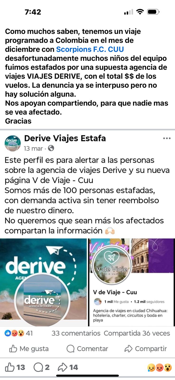 H. Cd de Chihuahua.- Padres de familia del equipo Scorpions F.C. CUU denunciaron por redes sociales que fueron presuntamente estafados por la agencia Viajes Derive, a la que le pagaron el costo total de unos vuelos para un viaje programado a Colombia en diciembre.