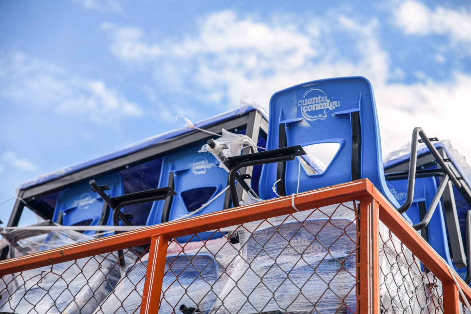El material distribuido incluye calentones de leña y a gas, aparatos de aire evaporativo, luminarias, pupitres, mesas, sillas, pizarrones, tinacos, además de cubetas de pintura e impermeabilizante, en beneficio de 19 mil 700 alumnos de 36 planteles de la zona.