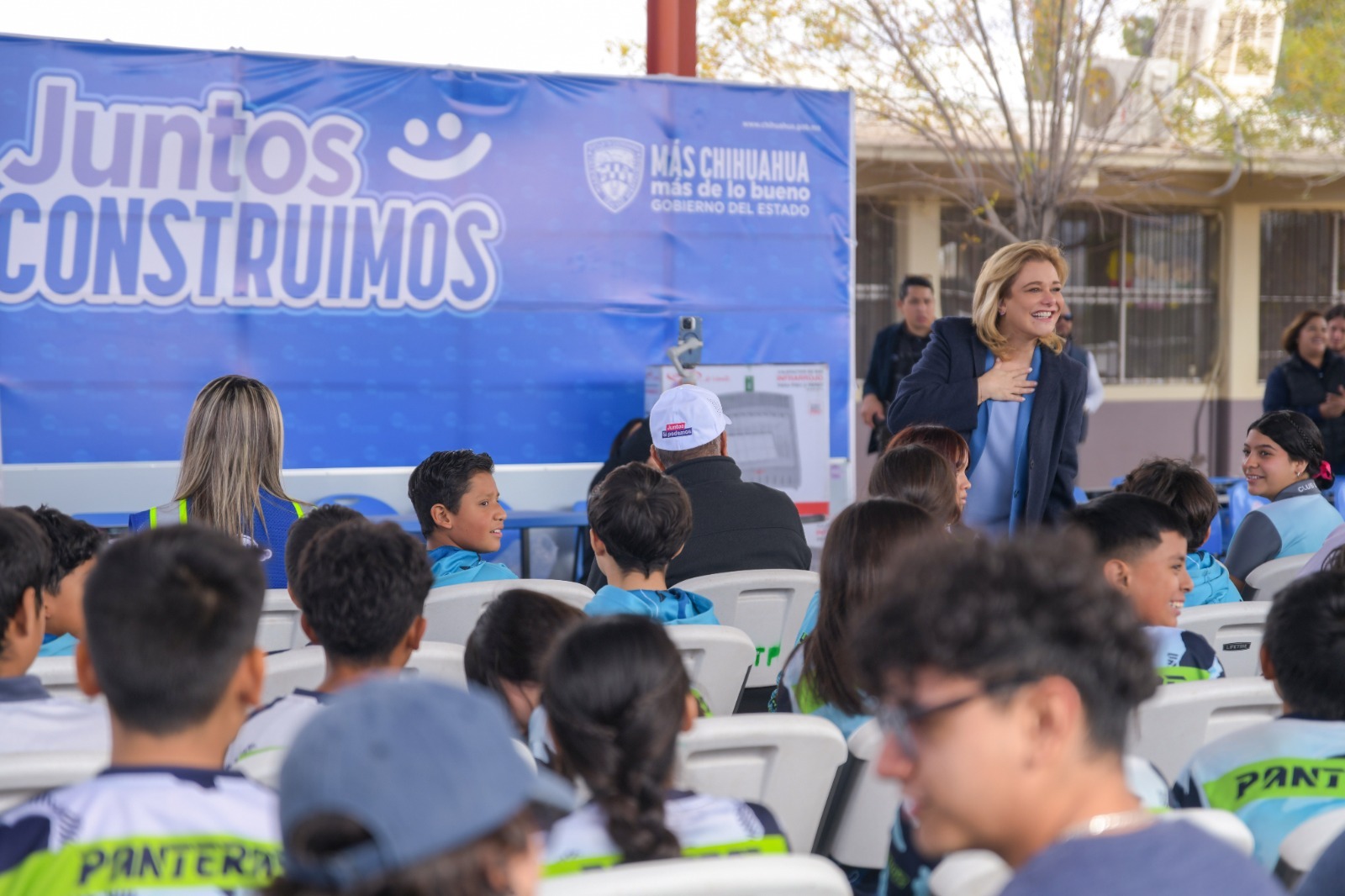La gobernadora Maru Campos encabezó la entrega de equipo y mobiliario para 36 escuelas de educación Básica de la región noroeste del estado, que significó una inversión superior a los 2 millones 800 mil pesos, como parte del programa Juntos Construimos.