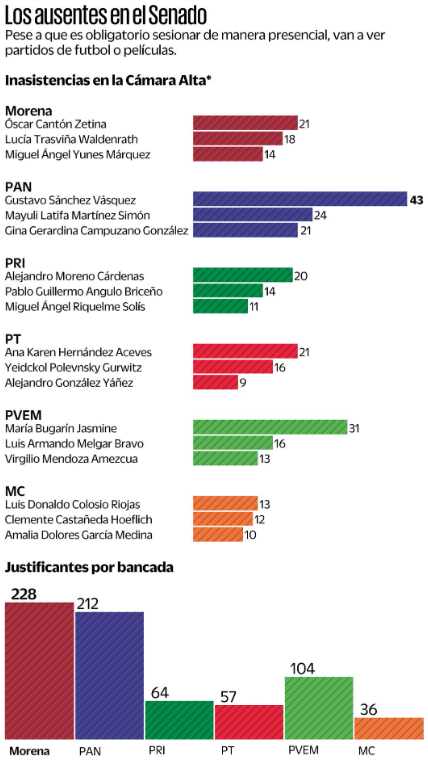 Entre los legisladores con más faltas destacan Gustavo Sánchez Vásquez (PAN) con 43 justificantes, Jasmine María Bugarín Rodríguez (PVEM) con 31 y Mayuli Latifa Martínez Simón (PAN) con 18. Morena es el grupo con más justificantes acumulados (228), aunque cinco de sus senadores no han faltado a ninguna sesión. Por el contrario, ningún senador del PRI, MC ni PT ha asistido a todas las sesiones, con 64, 36 y 57 justificantes expedidos respectivamente.