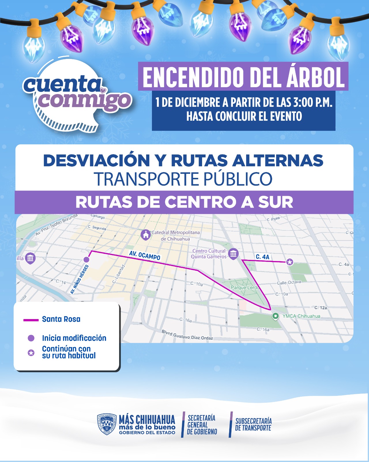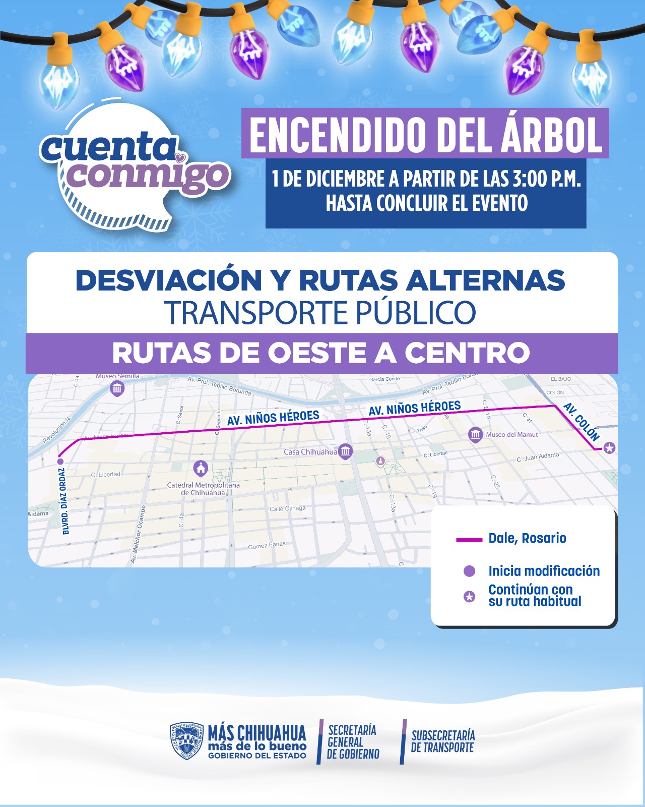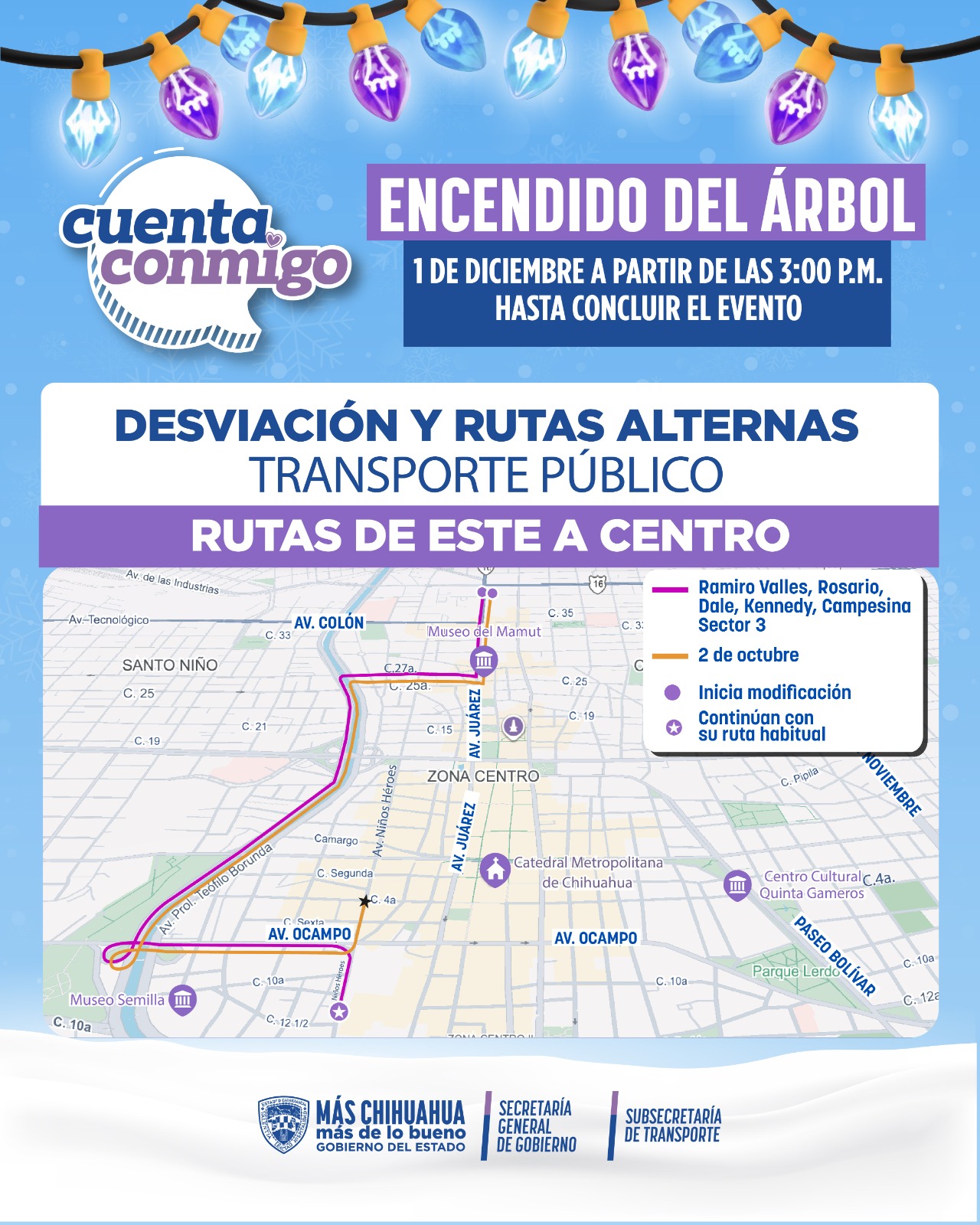H. Cd de Chihuahua.- La Subsecretaría de Transporte del Gobierno del Estado anunció cambios temporales en varias rutas de transporte público de la ciudad con motivo del Encendido del Árbol Navideño 2025, que se realizará este lunes 1 de diciembre.