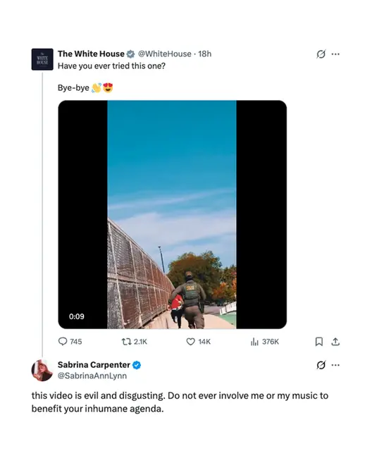 Sabrina Carpenter, explotó en redes sociales después de que la Casa Blanca publicara un video donde se mostraban redadas de ICE, protestas y detenciones de migrantes, todo acompañado por un fragmento viral de su canción “Juno”, incluida en su exitoso álbum Short n’ Sweet.