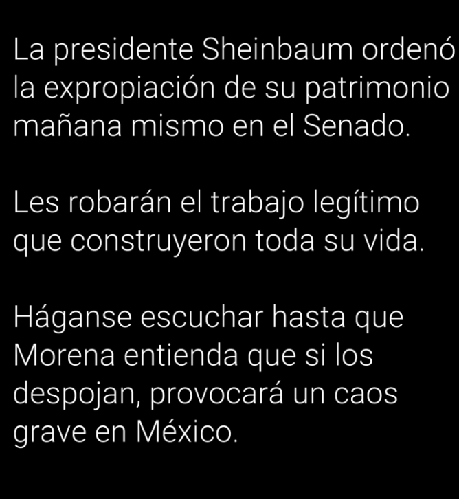 “La presidente Sheinbaum ordenó la expropiación de su patrimonio mañana mismo en el Senado. Les robarán el trabajo legítimo que construyeron toda su vida. Háganse escuchar hasta que Morena entienda que si los despojan, provocará un caos grave en México”, declaró Téllez.