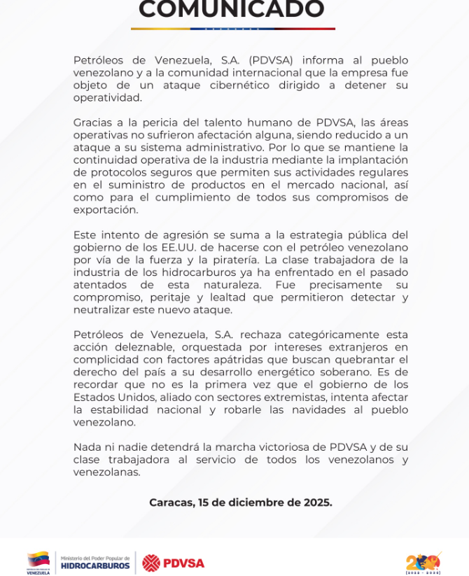 H. Cd de Chihuahua.- La estatal Petróleos de Venezuela (Pdvsa) informó este lunes que fue víctima de un ciberataque que buscaba frenar sus operaciones, en un hecho que la empresa vincula con acciones externas en su contra.