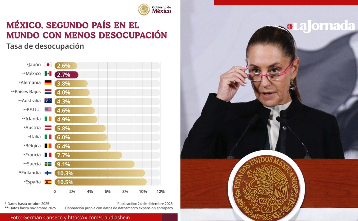 La presidenta de México, Claudia Sheinbaum, destacó a través de sus redes sociales que el país se ubica en el segundo lugar mundial con la tasa de desempleo