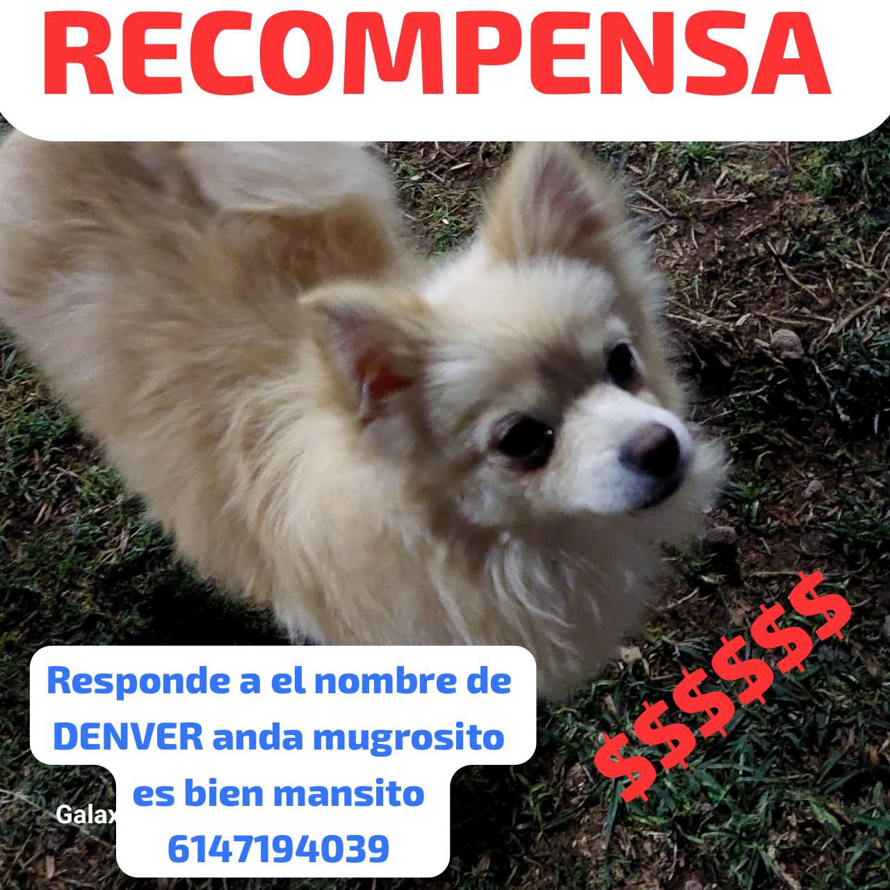 Denver es un perrito pequeño, tranquilo y muy cariñoso. Al momento de extraviarse se encontraba sucio y con el pelaje enredado, ya que no había sido bañado recientemente y no le gusta que lo cepillen. Como seña particular, presenta los dientes inferiores empalmados, posiblemente de leche, y responde a su nombre.