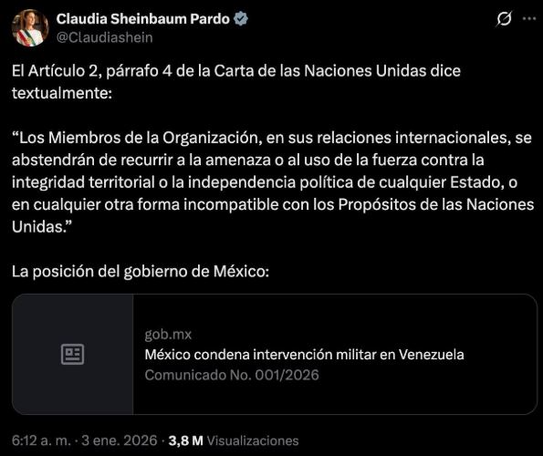 En su pronunciamiento, la mandataria expresó la condena del Gobierno de México a los bombardeos realizados en territorio venezolano, al considerar que se trata de una intervención que vulnera la soberanía de una nación extranjera.