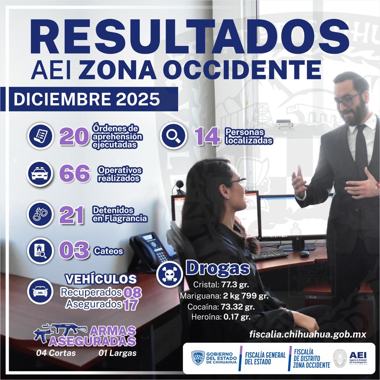 H. Cd de Chihuahua.- La Agencia Estatal de Investigación (AEI) en la Zona Occidente dio a conocer los resultados de sus operaciones durante diciembre de 2025 en los 20 municipios de la región.