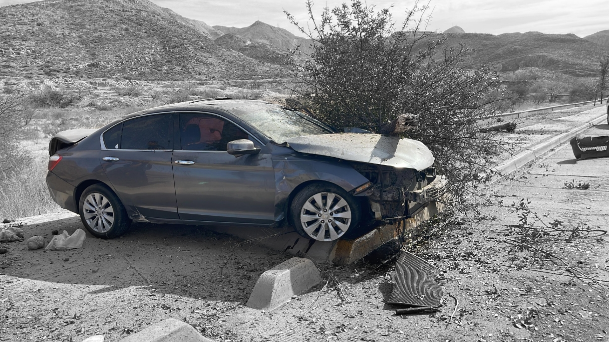 H. Cd de Chihuahua.- Viajaba rápido y terminó estampado con árbol en la Sacramento (en blanco y negro) Un fuerte accidente vial se registró en la Vialidad Sacramento,