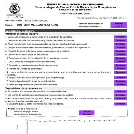 La evaluación docente realizada por estudiantes de la Facultad de Derecho colocó a Rafael Loera entre los profesores mejor calificados en la materia de Ciencia Política, reflejo de una práctica académica centrada en el diálogo, la reflexión y el análisis de la realidad contemporánea. De acuerdo con testimonios recogidos en el aula, su desempeño ha generado un ambiente participativo donde el intercambio de ideas y las preguntas profundas forman parte esencial del proceso de aprendizaje.