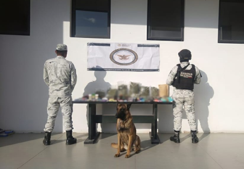 (En Blanco y Negro) Agentes de la Guardia Nacional aseguraron paquetes con narcótico y vapeadores con extracto de droga en el Aeropuerto Internacional de Querétaro. Durante recorridos de