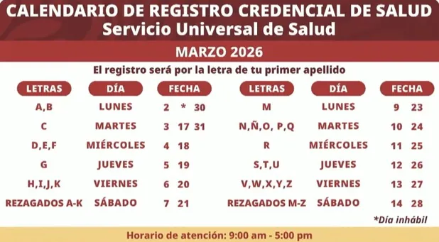 El registro se realizará de forma gradual de marzo a diciembre de 2026, organizado por la primera letra del apellido paterno y por etapas estatales. La secretaria de Bienestar, Ariadna Montiel, detalló que el trámite estará disponible de lunes a viernes y también los sábados para rezagados, con atención de 9:00 a 17:00 horas. En caso de alta demanda, el periodo de registro podría extenderse hasta enero de 2027.