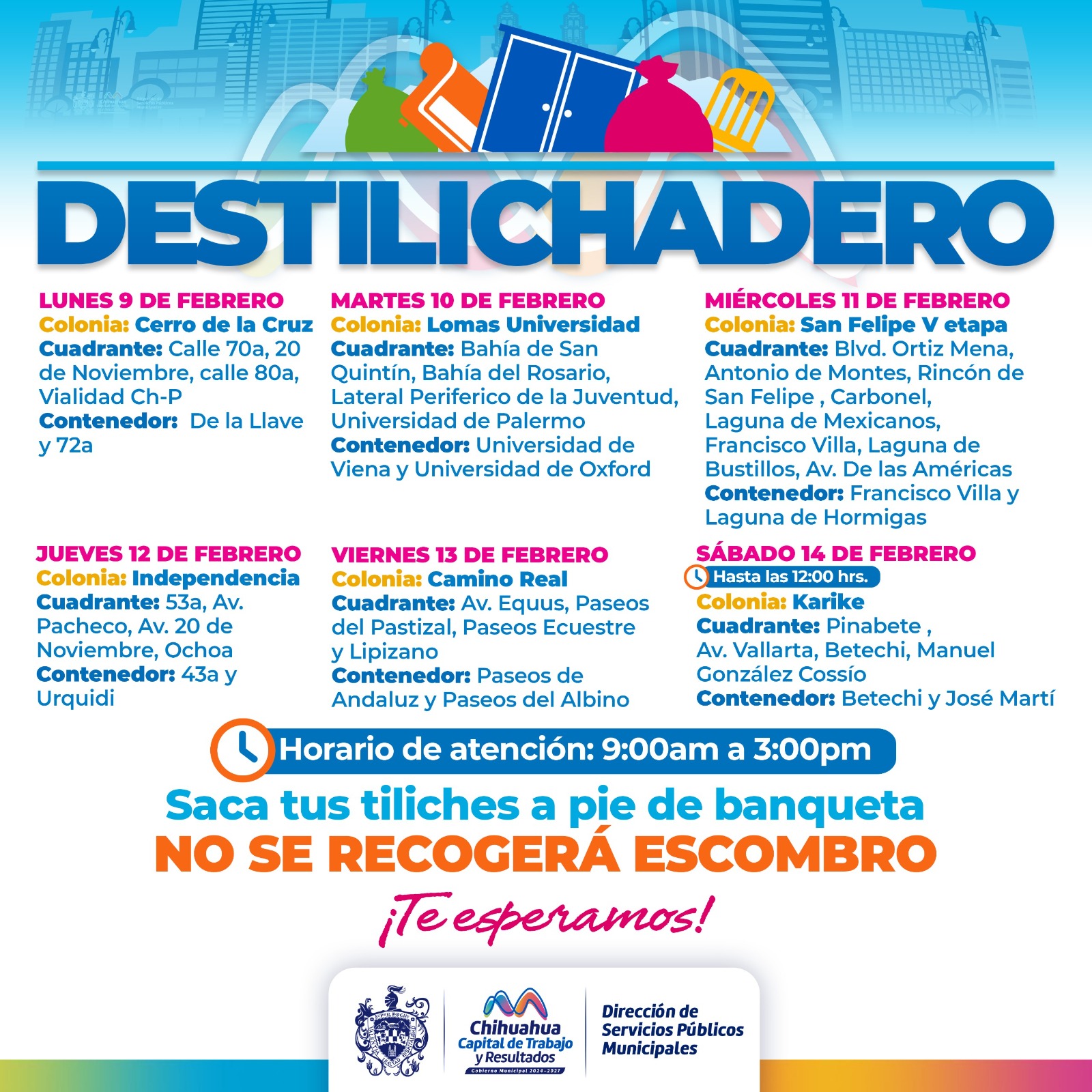 H. Cd de Chihuahua.- Del 9 al 14 de febrero, el Gobierno Municipal de Chihuahua llevará el programa Destilichadero a seis colonias de la ciudad, con el objetivo de ayudar a las familias a deshacerse de basura grande que ya no usan y así evitar plagas y problemas de salud en los hogares.