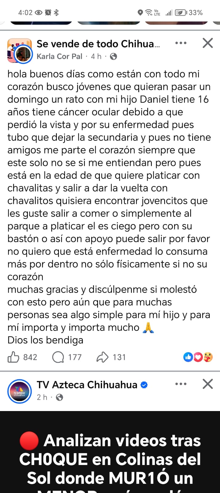 H. Cd de Chihuahua.- A través de redes sociales, una madre originaria de Chihuahua hizo un llamado solidario para encontrar jóvenes que puedan convivir y pasar tiempo con su hijo Daniel, de 16 años, quien enfrenta cáncer ocular y perdió la vista.