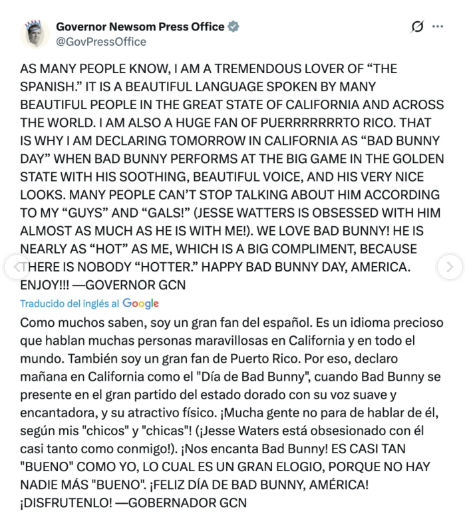 A través de sus redes sociales, Newsom compartió un mensaje que no pasó desapercibido: aseguró ser “un gran fan de Puerto Rico” y justificó así su decisión simbólica. Además, lanzó una frase que generó reacciones divididas por su tono irónico: “Es casi tan ‘bueno’ como yo, lo cual es un gran elogio, porque no hay nadie más ‘bueno’. ¡Feliz día de Bad Bunny, América!”.