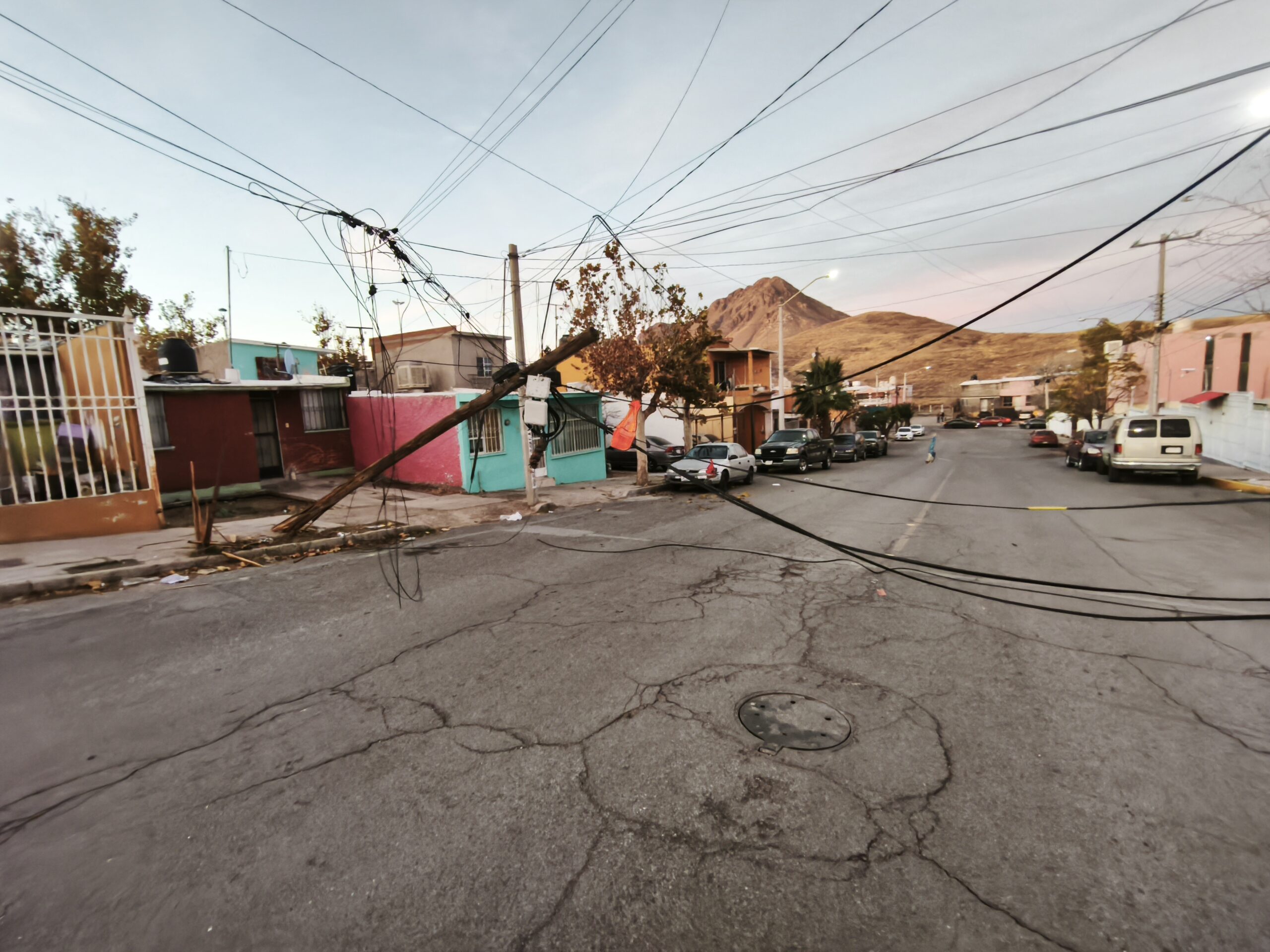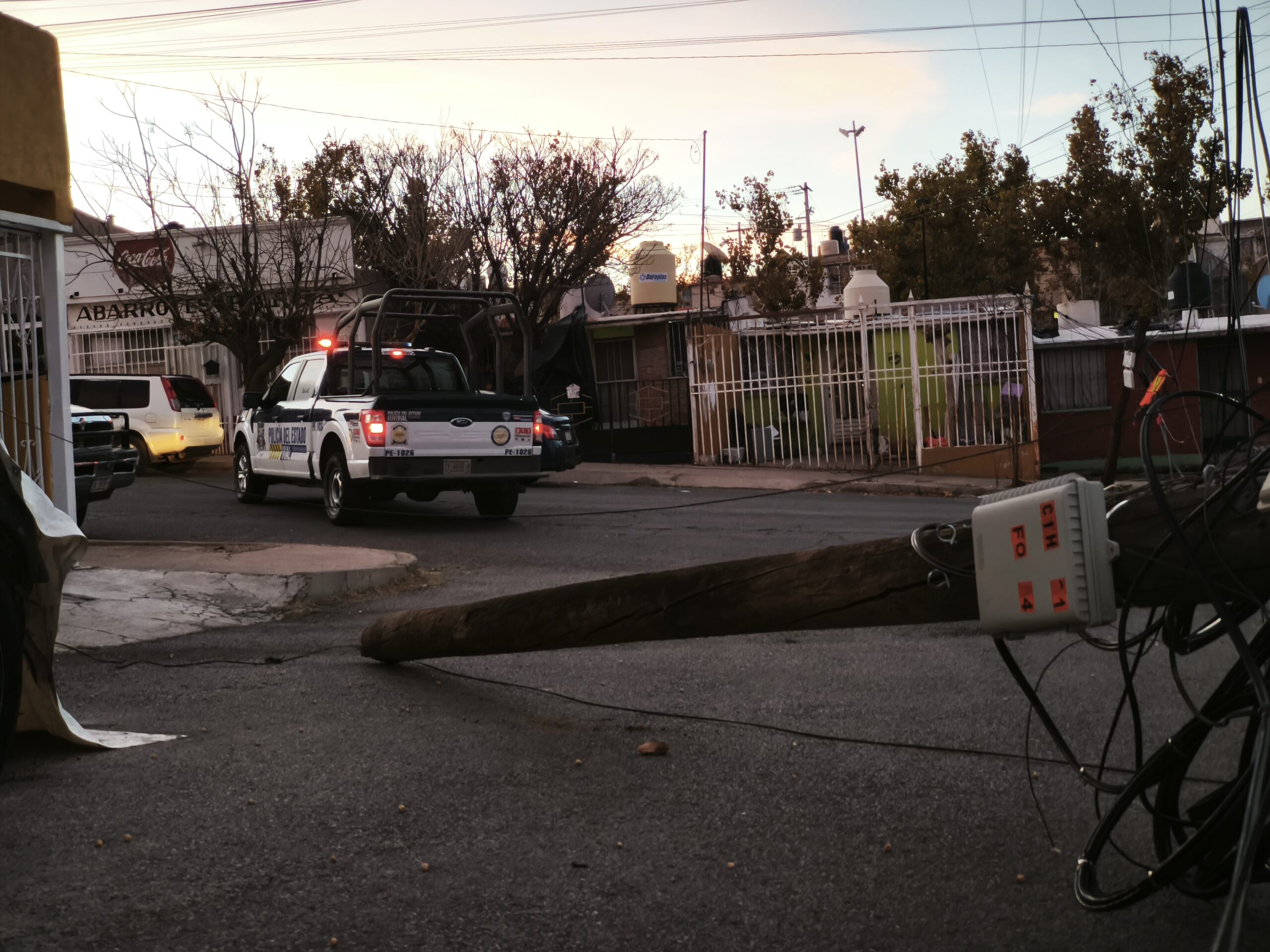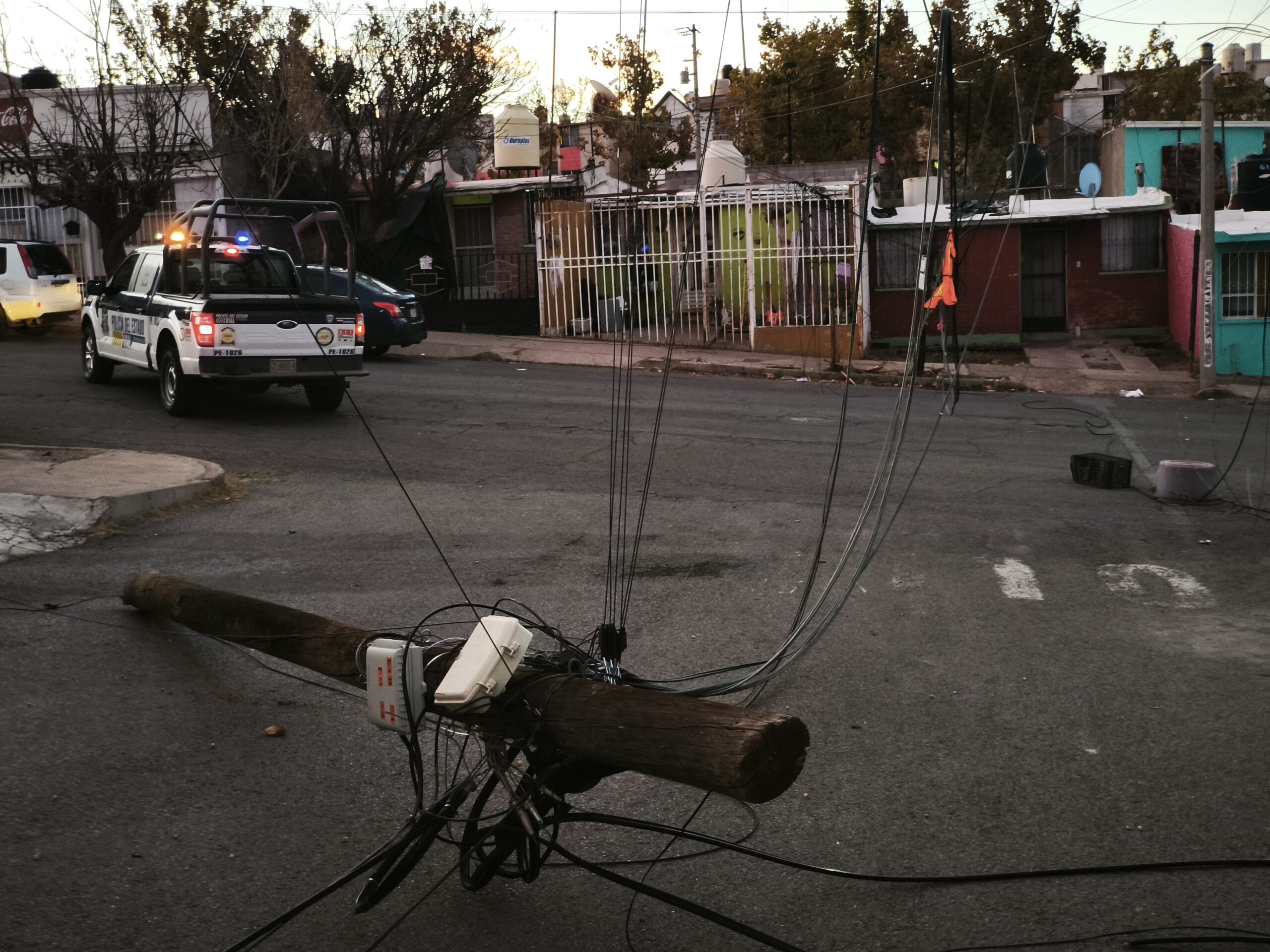 H. Cd de Chihuahua.- Un fuerte accidente vial provocó el derribo de dos postes de madera de líneas telefónicas en la colonia Mármol, lo que generó daños materiales y el cierre de las calles afectadas.