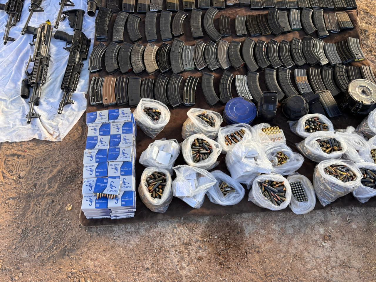 En el interior del domicilio, las autoridades localizaron un arsenal de alto poder compuesto por 19 armas largas, dos armas cortas y dos lanzagranadas, además de una gran cantidad de explosivos que incluía siete granadas calibre 40 mm y una granada de mano. L os agentes contabilizaron también más de 5,830 cartuchos útiles, 21 cargadores de diversos calibres y siete cargadores de tipo tambor, equipo que era presuntamente utilizado para actividades delictivas de alto impacto en la región serrana del estado.