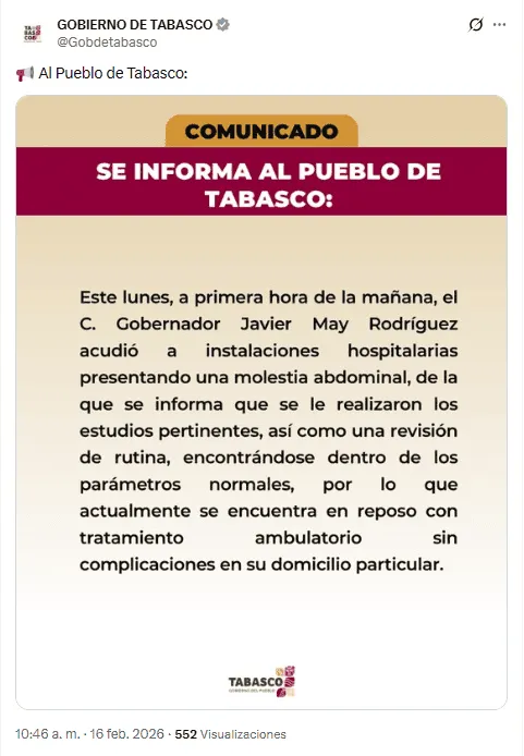 El gobierno de Tabasco informó que la mañana de este lunes 16 de febrero el gobernador Javier May Rodríguez acudió a un hospital tras presentar una molestia abdominal. De acuerdo con el comunicado oficial, al mandatario se le realizaron estudios médicos y una revisión de rutina, cuyos resultados se encontraron dentro de los parámetros normales.