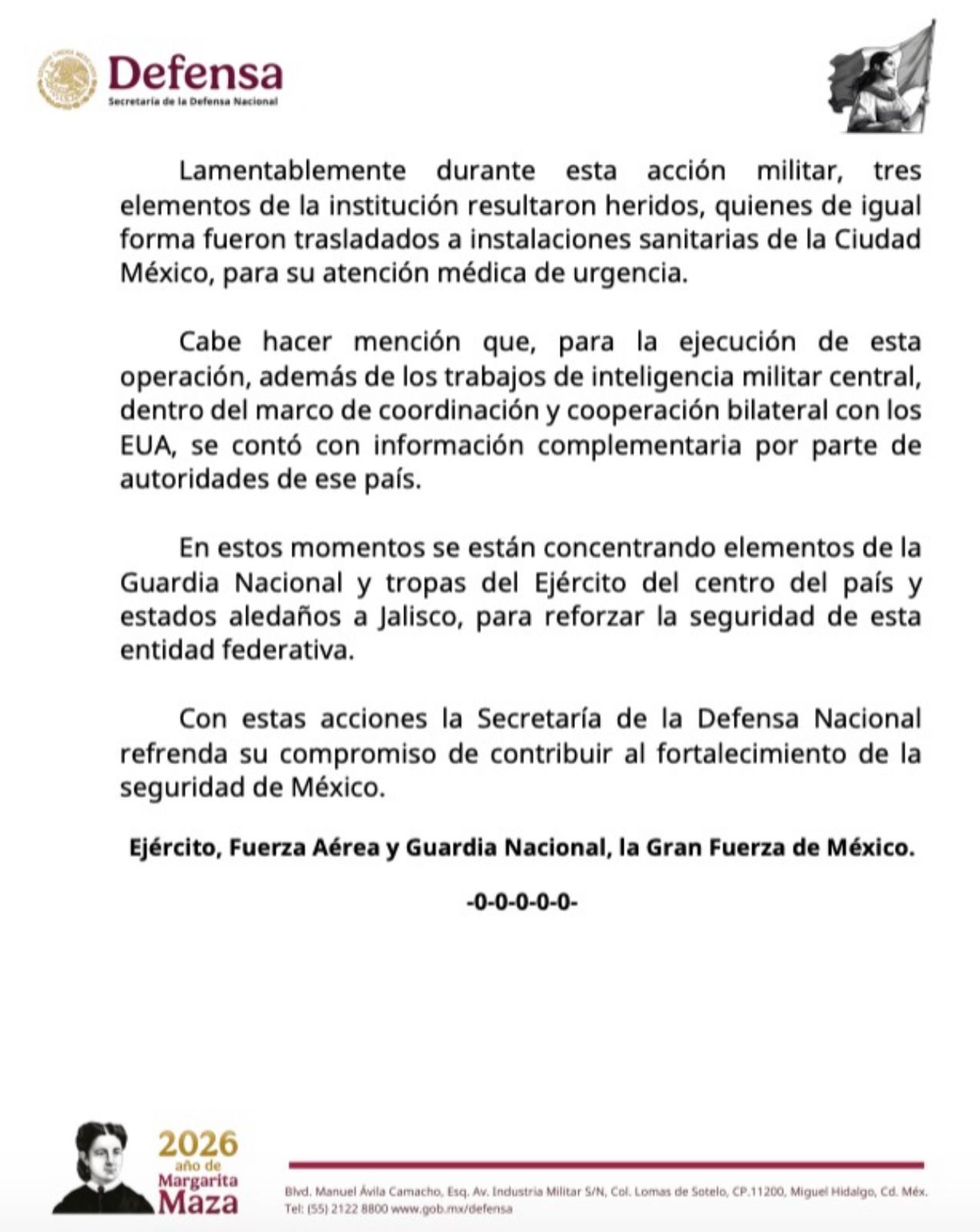 El comunicado oficial también confirmó que tres elementos militares resultaron heridos y fueron atendidos en instalaciones médicas de la Ciudad de México. La SEDENA destacó que la operación contó con información complementaria de autoridades de Estados Unidos, en el marco de la cooperación bilateral. Además, se reforzó la seguridad en Jalisco con presencia de la Guardia Nacional y tropas del Ejército de estados cercanos, reiterando el compromiso de las Fuerzas Armadas con la seguridad del país. (En Blanco y Negro)