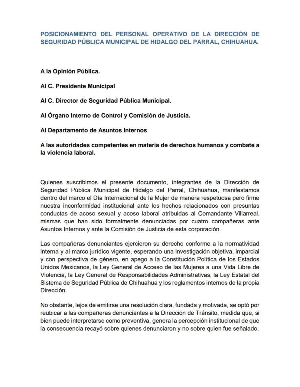H. Cd. de Chihuahua.- Una denuncia anónima ha puesto en alerta a la Dirección de Seguridad Pública Municipal de Parral, Chihuahua, al señalar presunto acoso laboral y sexual por parte de un mando identificado con el apellido Villarreal. De acuerdo con la denuncia, las afectadas presentaron quejas formales ante Asuntos Internos y la Comisión de Justicia de la corporación, sin que hasta ahora se haya dado respuesta ni se hayan tomado medidas. Ante la falta de acción interna, las víctimas hicieron pública la situación y remitieron la denuncia al presidente municipal, síndica, regidores y medios de comunicación.