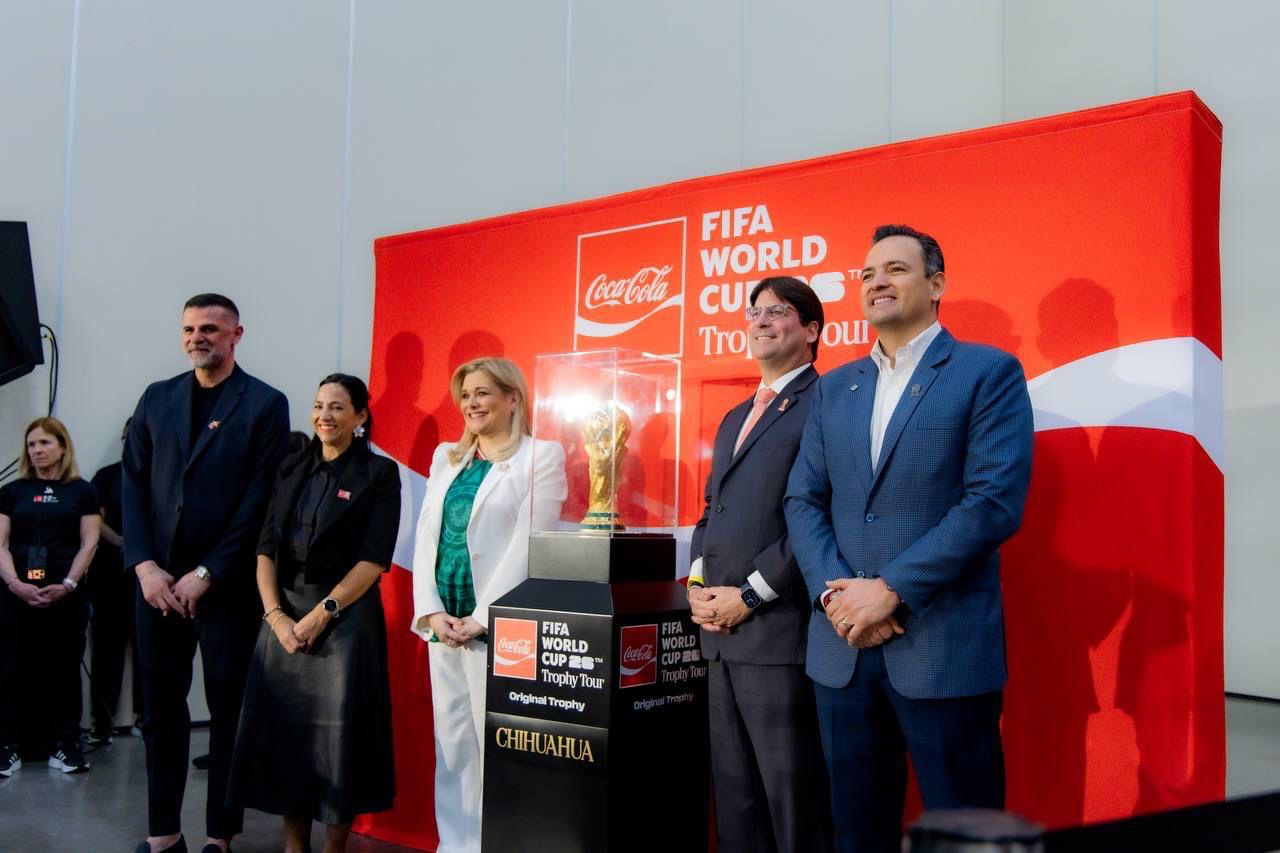 H. Cd de Chihuahua.- El alcalde de Chihuahua, Marco Bonilla, celebró la llegada del Trofeo Original de la Copa Mundial de la FIFA a la capital del estado, como parte del tour mundial organizado por Coca-Cola.
