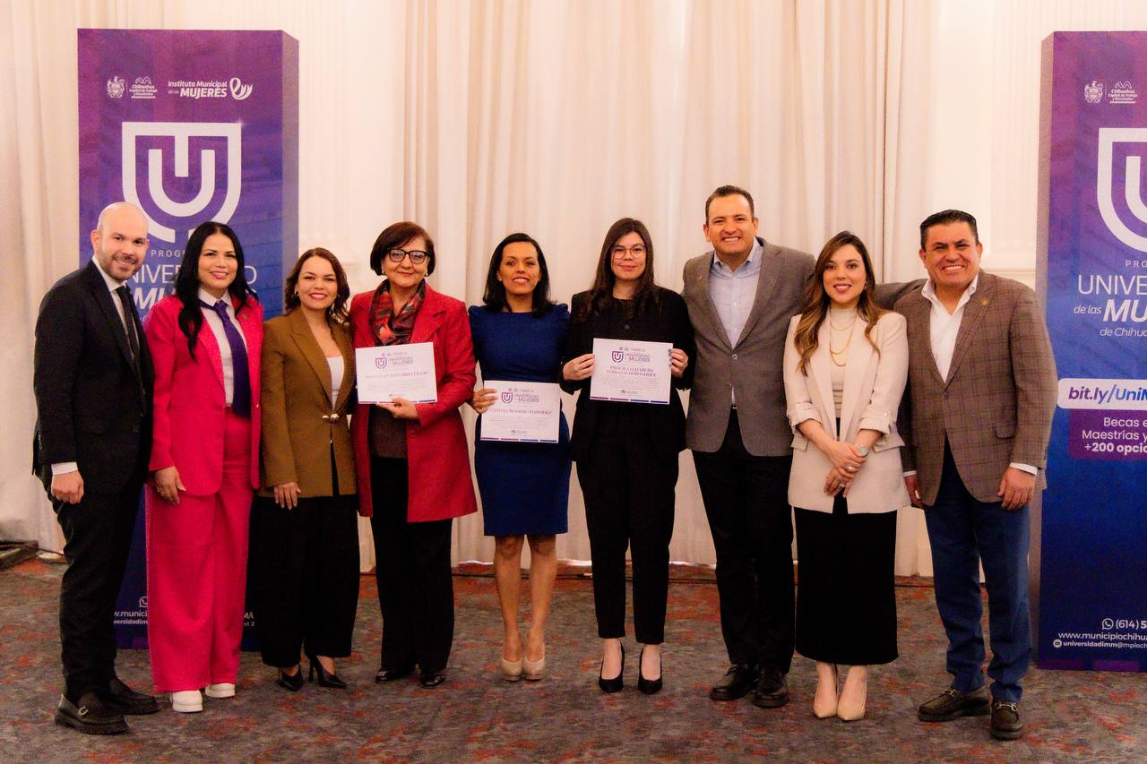 H. Ciudad de Chihuahua, Chih., a 12 de marzo de 2026.– El alcalde Marco Bonilla encabezó la entrega de reconocimientos a Rebecca Giovana Cheda, Ana Karen López y Sandra Luz Márquez, quienes se convirtieron en las primeras alumnas en concluir sus especialidades en el programa de la Universidad de las Mujeres, un proyecto impulsado por el Gobierno Municipal para ampliar las oportunidades educativas y profesionales para las chihuahuenses.