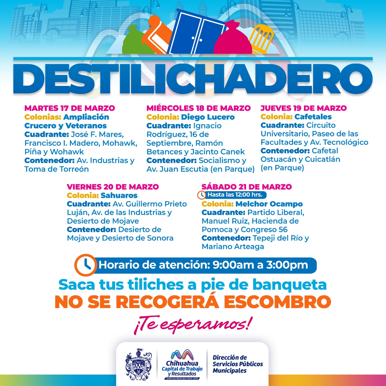 H. Cd de Chihuahua.- El Gobierno Municipal de Chihuahua anunció que el programa Destilichadero se realizará del 17 al 21 de marzo en seis colonias de la capital, con el objetivo de retirar basura de gran tamaño que no puede llevarse el camión recolector común y así prevenir plagas y riesgos a la salud.