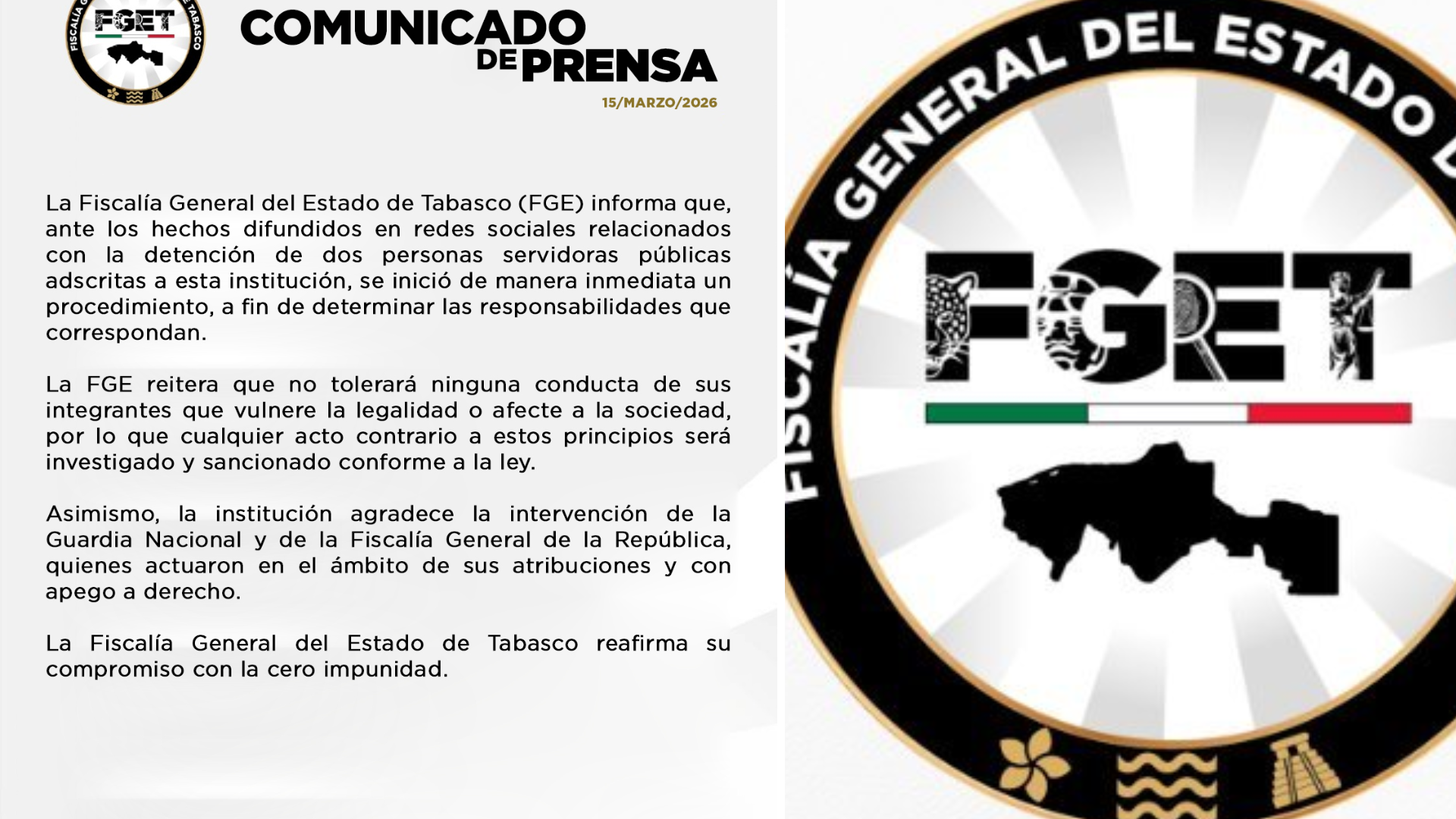 H. Cd de Chihuahua.- La Fiscalía General del Estado (FGE Tabasco) confirmó que más de 800 servidores públicos en Tabasco están bajo investigación, tras la detención de dos