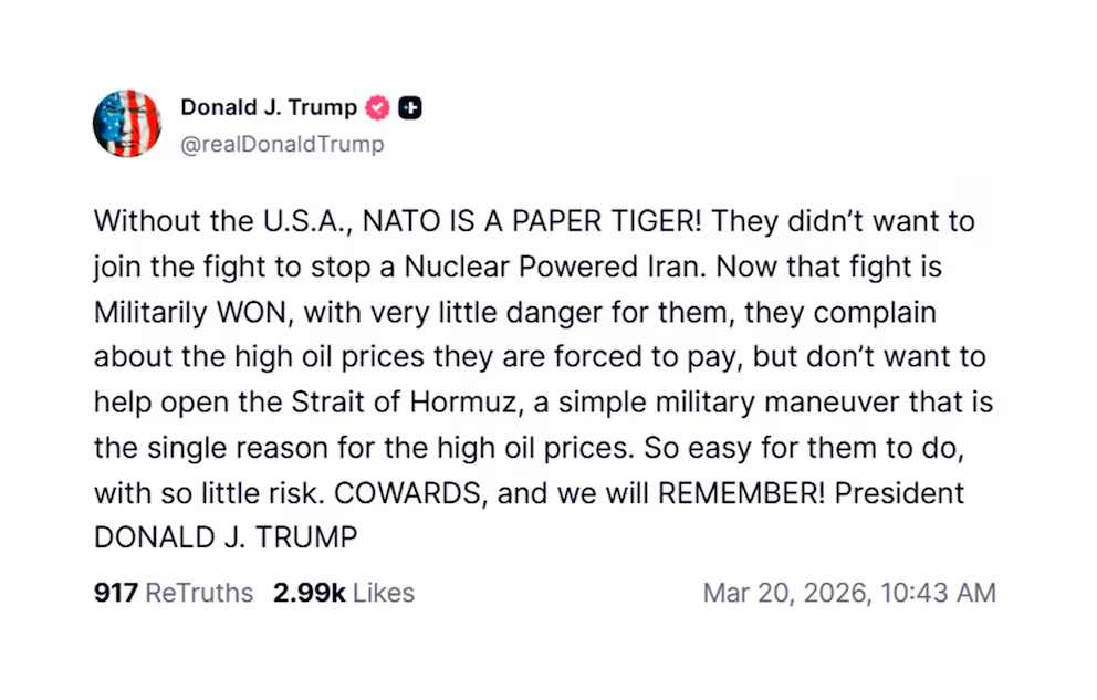 A través de su red Truth Social, el mandatario calificó a sus aliados como “cobardes” y aseguró que, pese a beneficiarse de la intervención estadounidense, no han querido participar en la operación para garantizar el paso marítimo, clave para el comercio de petróleo.