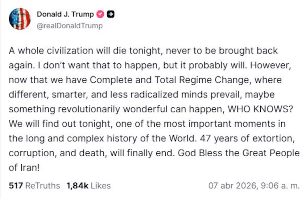 El presidente de Estados Unidos, Donald Trump, aseguró que en Irán podría darse un “cambio total y completo de régimen”, al afirmar que “47 años de extorsión, corrupción y muerte” llegarían a su fin. A través de la red social Truth Social, advirtió incluso que “una civilización entera podría desaparecer” en medio del conflicto.