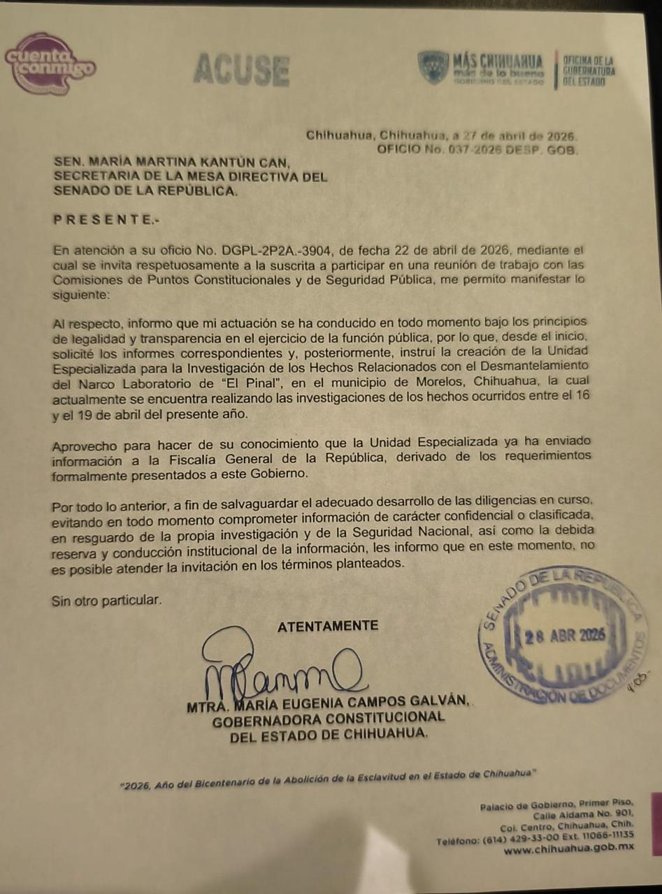 La gobernadora Maru Campos declinó participar en reunión de trabajo en el Senado de la República para no comprometer las investigaciones en curso. La decisión fue notificada mediante oficio dirigido a la senadora María Martina Kantún Can, secretaria de la Mesa Directiva del Senado.