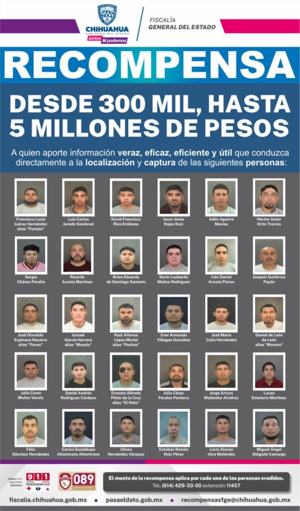 Este miércoles por la noche, la fiscalía estatal difundió las imágenes de los 30 reos del Cereso Estatal número 3 que se evadieron tras el motín del domingo 1 de enero, documento en el que ofrecen recompensa a quien lleve a su captura.