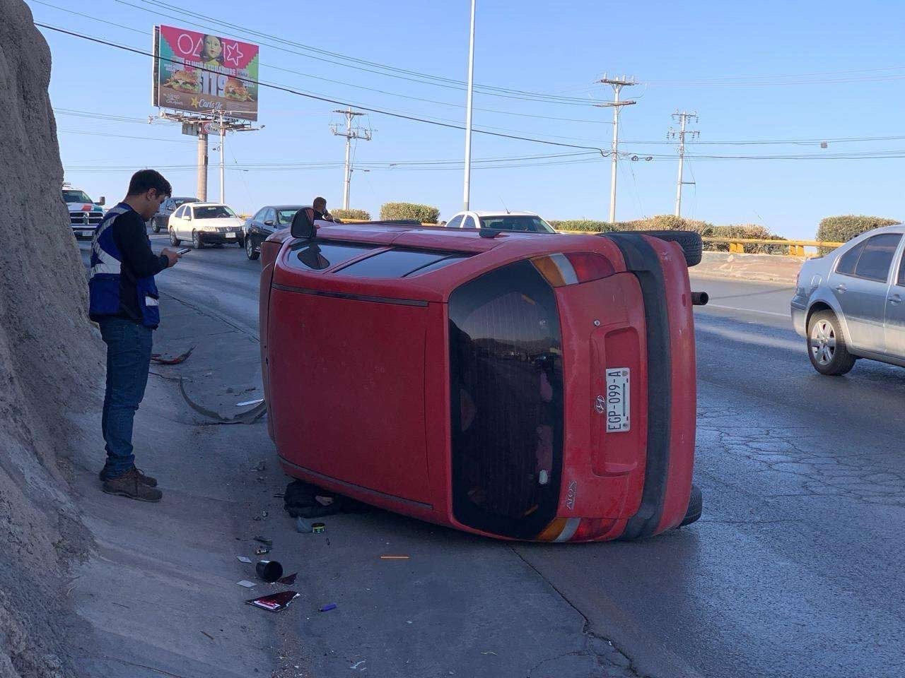 Chihuahua, Chih.- Dos personas terminaron con golpes y tremendo susto luego de que su Dodge Atos rojo chocara contra la pared del cerro y terminara volcado sobre el Periférico de la Juventud.