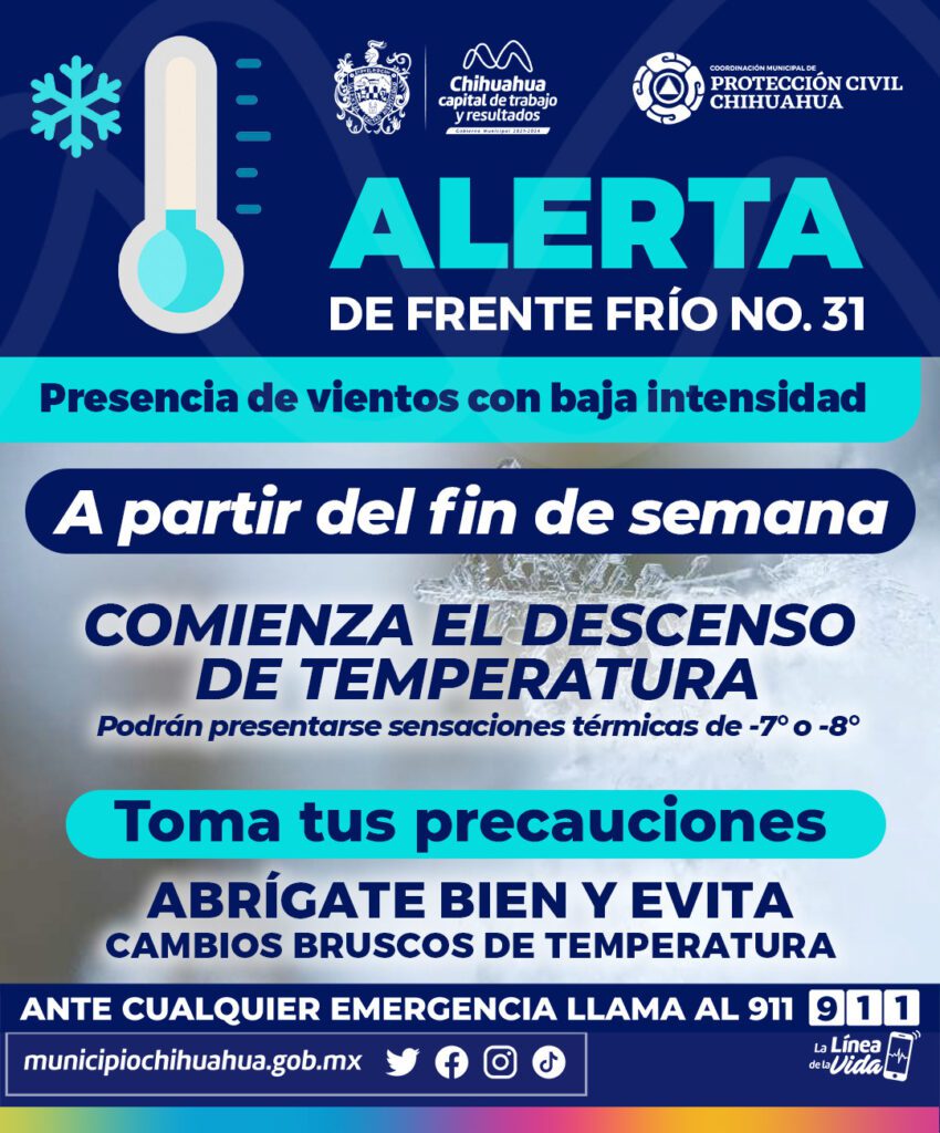 Para mañana viernes 10 de febrero, se pronostica un descenso marcado en la temperatura en Chihuahua Capital, misma que podría registrar los menos tres grados centígrados (-3°C), alertó el Gobierno Municipal de Chihuahua.