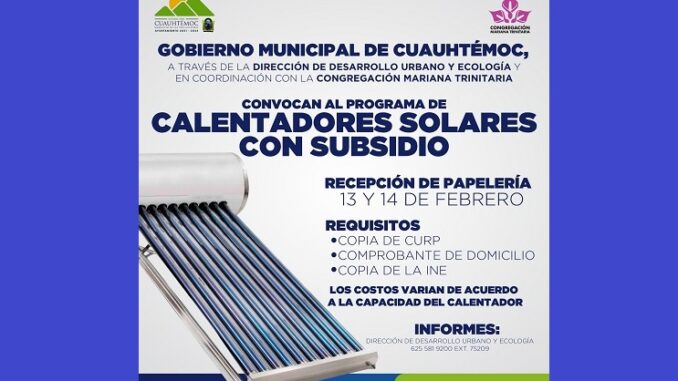 Cuauhtémoc.- Gobierno Municipal de Cuauhtémoc, a través de la Dirección de Desarrollo Urbano y Ecología y en coordinación con la Congregación Mariana Trinitaria, convocan al programa de Calentadores Solares con subsidio.