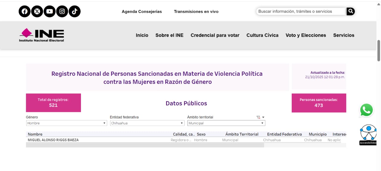 El Regidor de Morena, Miguel Alonso Riggs Baeza, fue registrado oficialmente como sancionado por violencia contra las mujeres tanto en el padrón estatal como en el federal, donde permanecerá inscrito hasta el 6 de abril de 2026.