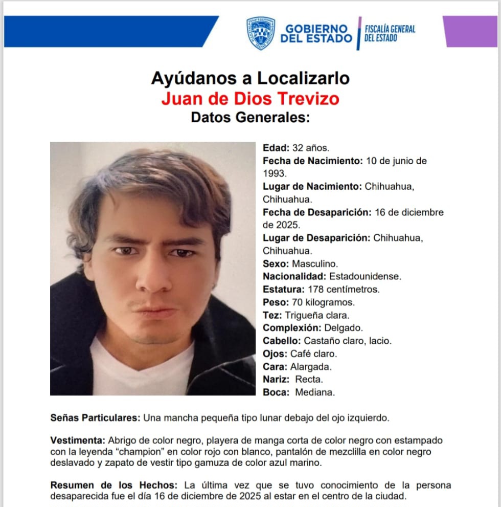 La Fiscalía General del Estado solicita la colaboración de la ciudadanía para localizar a Juan de Dios Trevizo, de 32 años, quien fue reportado como desaparecido el 16