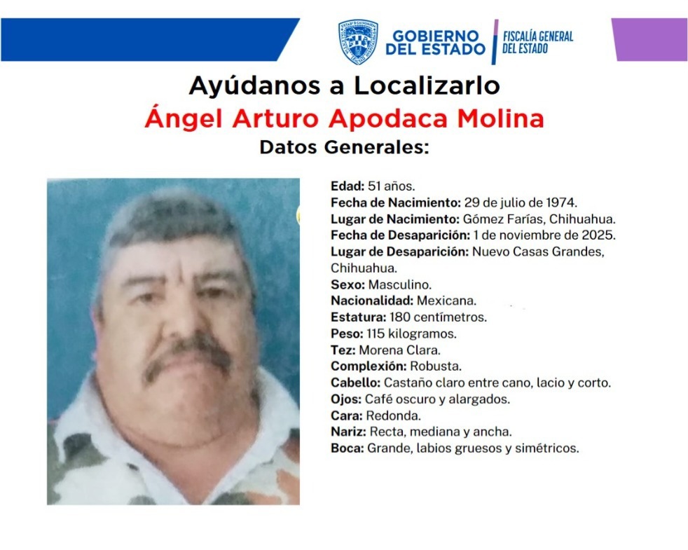 Las autoridades y familiares solicitan la colaboración de la ciudadanía para localizar a Ángel Arturo Apodaca Molina, de 51 años de edad, quien fue visto por última vez