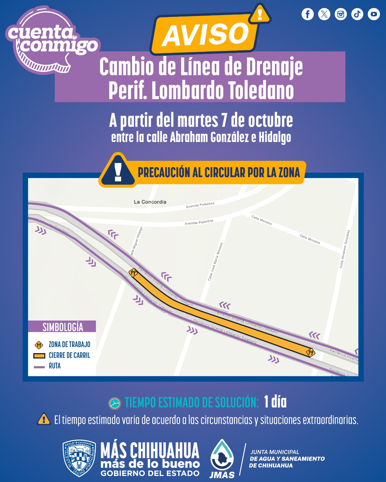 H. Cd. de Chihuahua.- La Junta Municipal de Agua y Saneamiento (JMAS) de Chihuahua informó que, este martes 7 de octubre realizará los trabajos de reparación de un