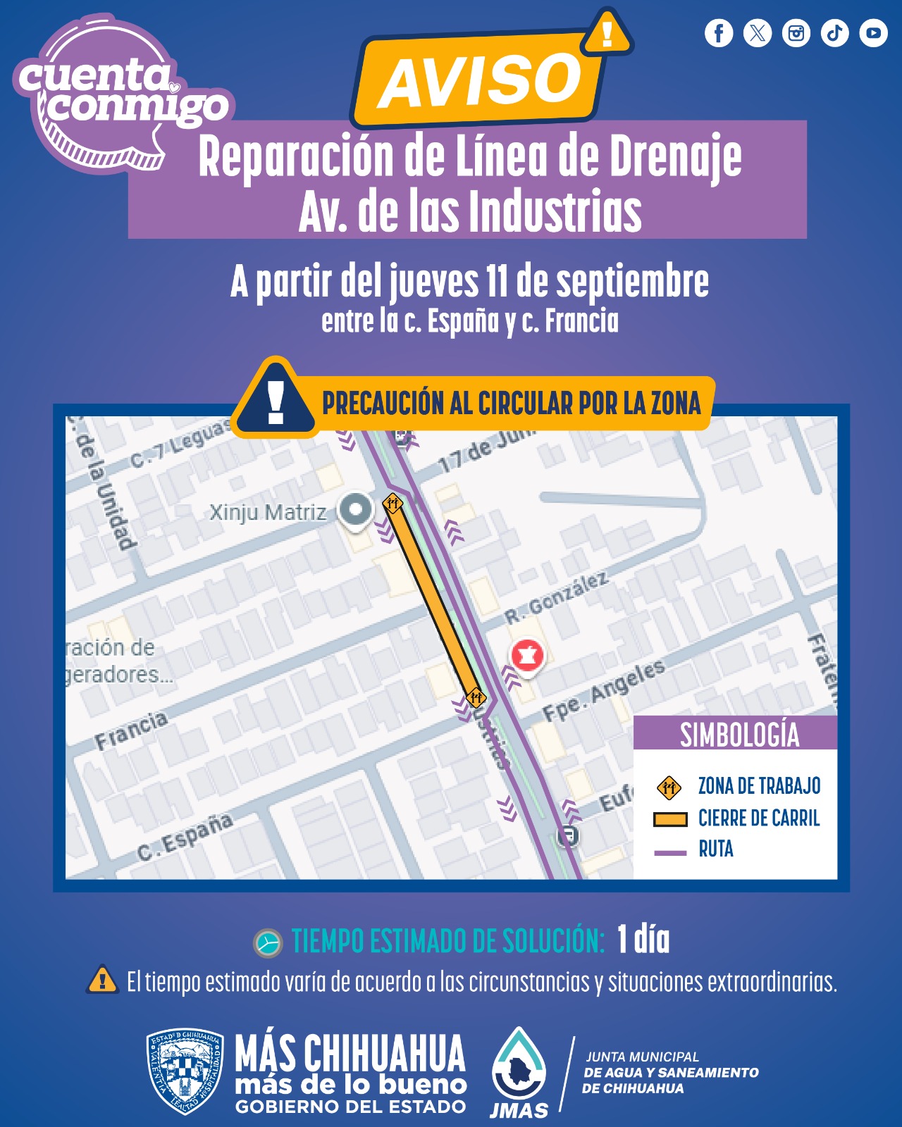 La Junta Municipal de Agua y Saneamiento (JMAS) de Chihuahua informó que, el jueves 11 de septiembre iniciará los trabajos de reparación de un tramo de tubería de