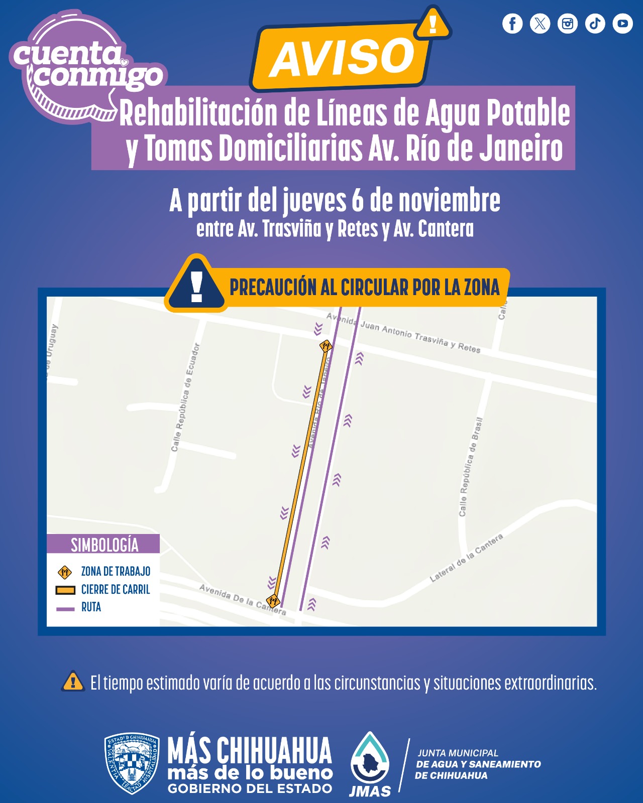 H. Cd. de Chihuahua.- La Junta Municipal de Agua y Saneamiento (JMAS) de Chihuahua iniciará este jueves 6 de noviembre, los trabajos de rehabilitación de líneas de agua