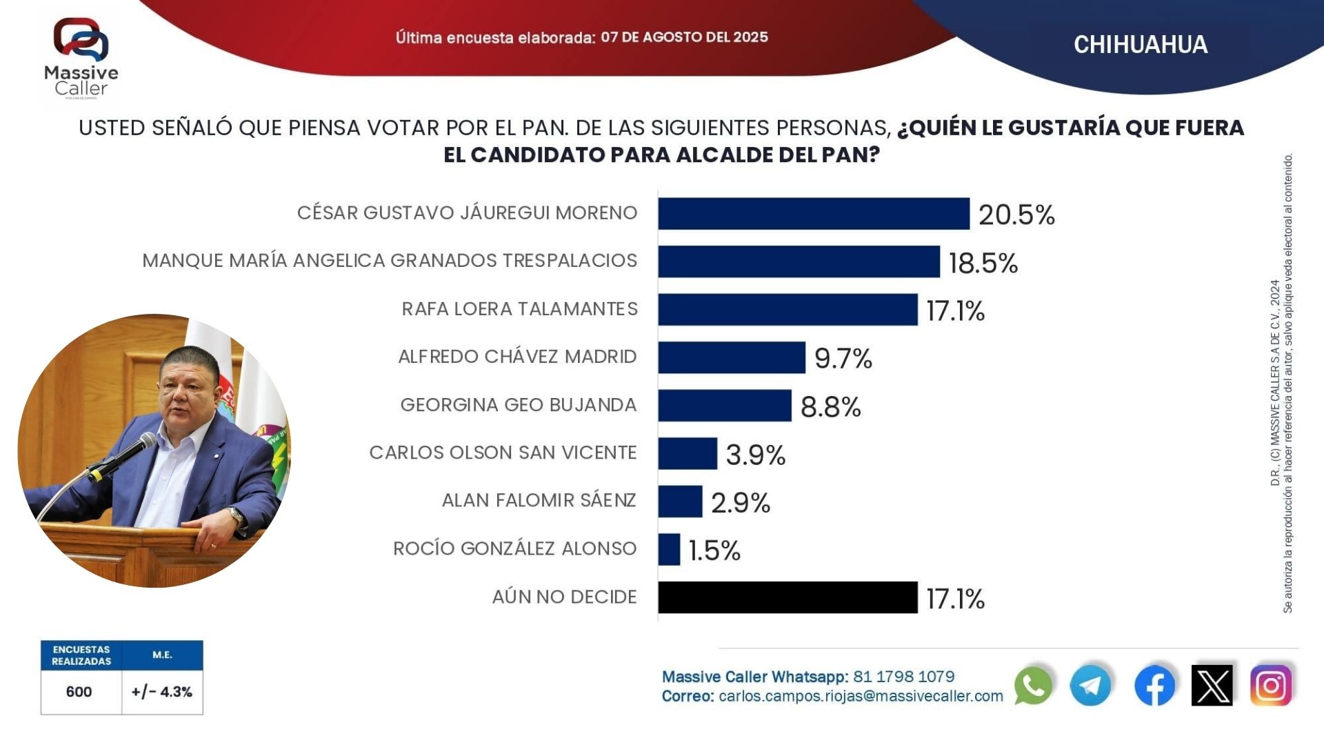 H. Cd de Chihuahua.- Con 20.5% de preferencia entre los votantes del PAN, César Jáuregui Moreno se perfila como el favorito para competir por la alcaldía de Chihuahua,
