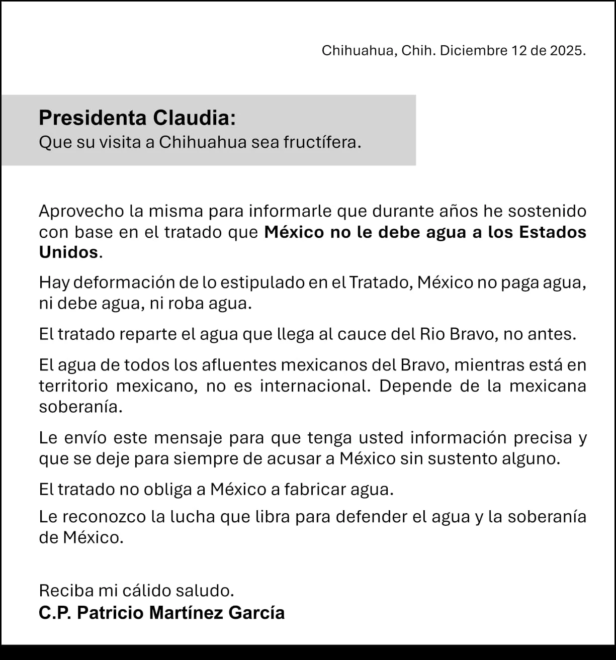 H. Cd. de Chihuahua.- El ex gobernador de Chihuahua, Patricio Martínez García, envió una carta a la presidenta Claudia Sheinbaum durante su visita al estado, en la que